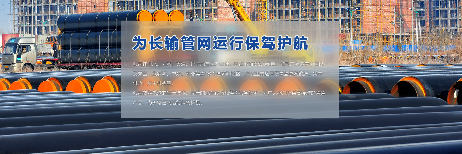 公司在河北、內(nèi)蒙、天津、遼寧均有生產(chǎn)基地,總占地面積500余畝。公司產(chǎn)品覆蓋中國以及蒙古、俄羅斯、中東、南非等20 多個國家和地區(qū),產(chǎn)品主要應用于高溫蒸汽輸送、集中供熱、集中供冷等。 公司依靠先進的生產(chǎn)技術、完善的配套設備和供貨服務體系,為廣大客戶提供高標準的管道產(chǎn)品,為長輸管網(wǎng)運行保駕護航。